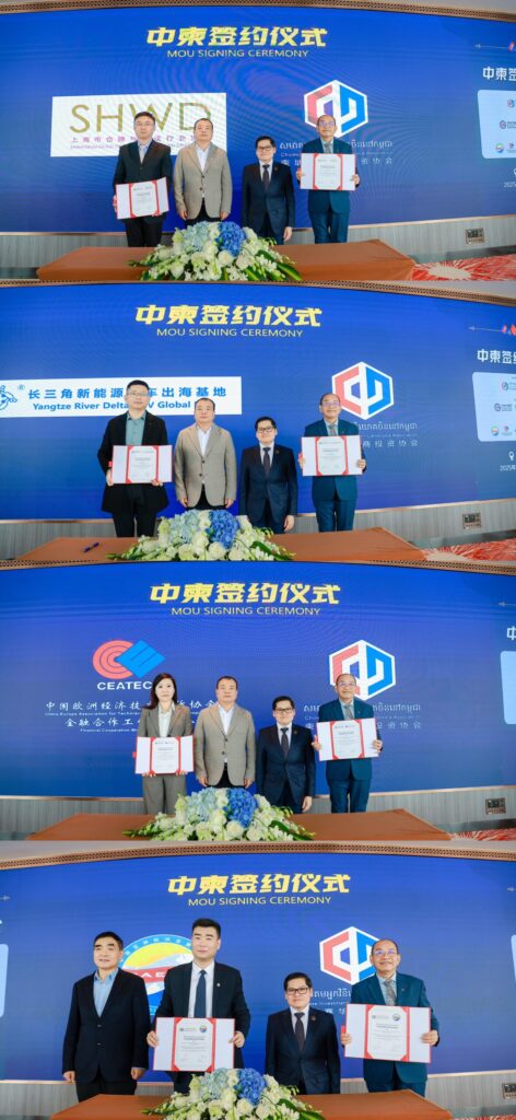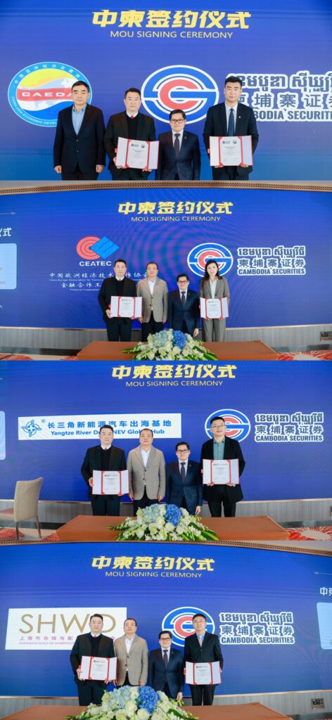 签约仪式上,中国亚洲经济发展协会副会长申坤、中国欧洲经济技术合作协会金融合作工作委员会会长顾春娟、上海市仓储与配送行业协会秘书长孙汕、长三角新能源汽车出海基地产业促进中心总经理袁金河等中方代表,分别与柬埔寨华商投资协会会长Dr. Heng Vuthy博士阁下及柬埔寨证券公司董事长邓镇岳先生签署了合作协议。