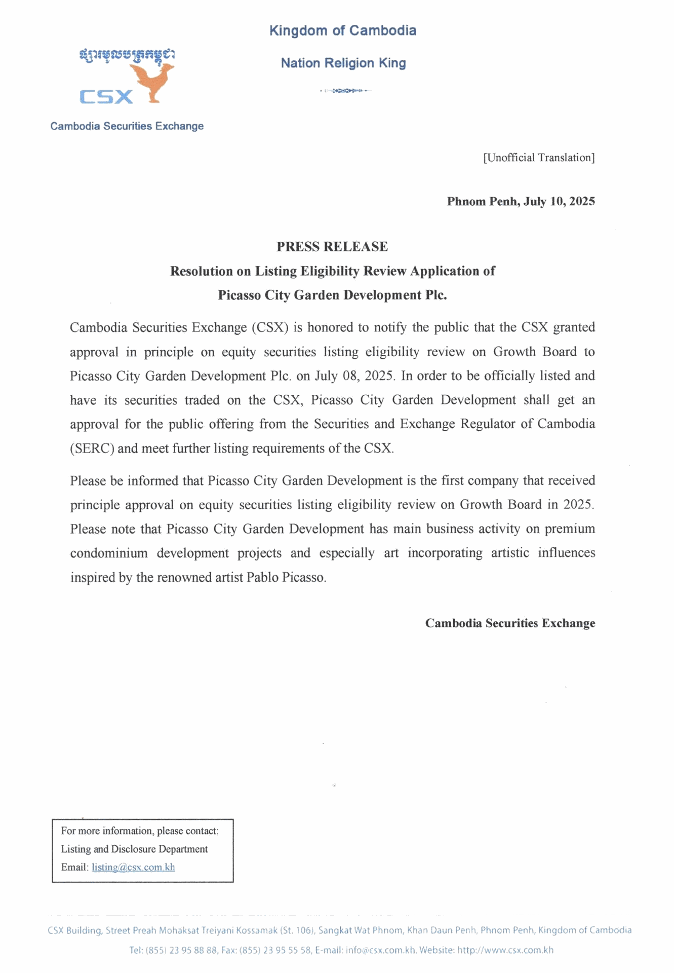As the sole underwriter of Picasso City Garden Development Plc., for the initial public offering of equity securities, we, Cambodia Securities Plc., are honored to announce and extend our warmest congratulations to Picasso City Garden Development Plc., on obtaining the approval in principle on equity securities listing eligibility review on the Growth Board from Cambodia Securities Exchange.