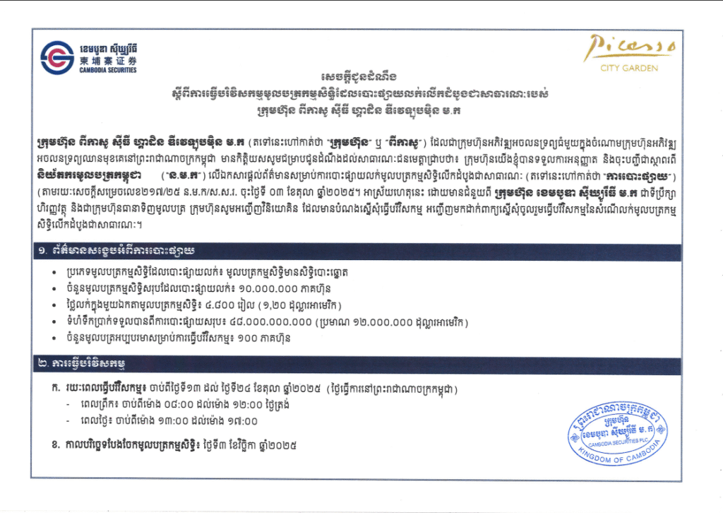 ស្តីពីការធ្វើបរិវិសកម្មមូលបត្រកម្មសិទ្ធិដែលបោះផ្សាយលក់លើកដំបូងជាសាធារណៈរបស់ ក្រុមហ៊ុន ពីកាសូ ស៊ីធី ហ្គាដិន ឌីវេឡុបម៉ឺន ម.ក